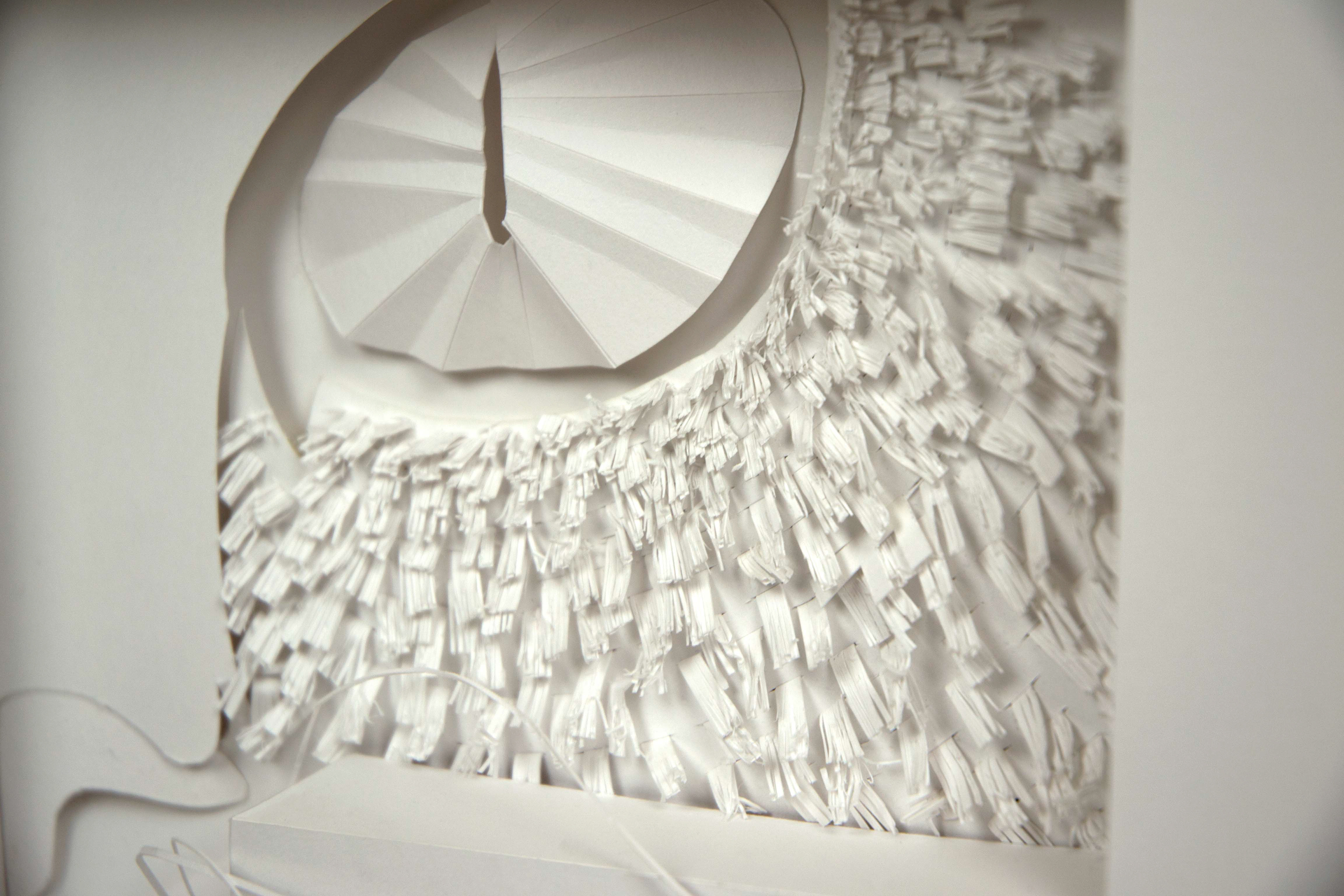 Here is a sculpture showing a cropped close-up of a cat’s face, made entirely out of only paper and glue. Different folding and cutting techniques were used to create implied textures.